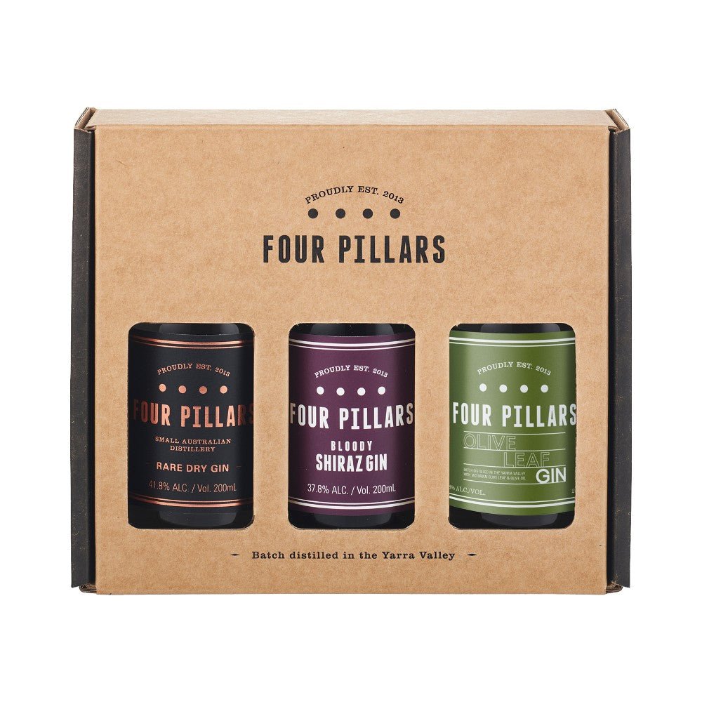 Enjoy the most delicious and intriguing Aussie gins. Three generously-sized 200mL mini bottles of Four Pillars gin, including the deliciously modern Rare Dry Gin, the cult favourite Bloody Shiraz Gin, and the creatively Mediterranean Olive Leaf Gin.