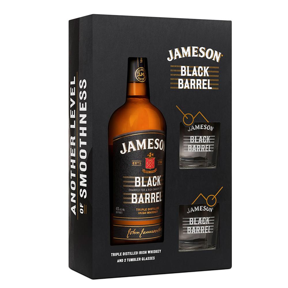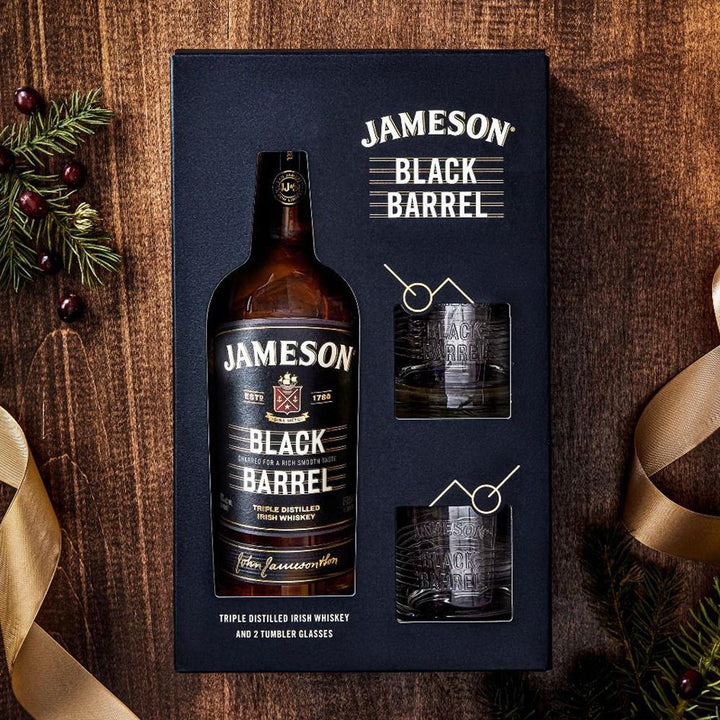 This gift pack includes a 700mL bottle of Jameson Black Barrel and two Jameson branded tumbler glasses.